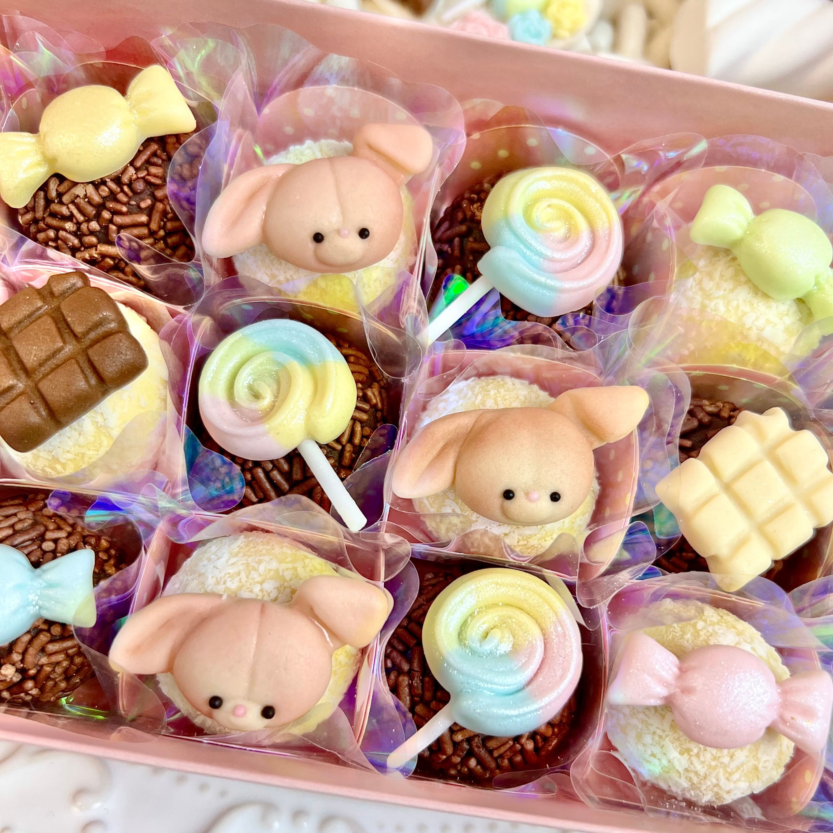 Belga, Prestígio, Nozes, Pistache, Confetes, Palha Italiana, Pão de Mel, Oreo, Dragê e Cookie.